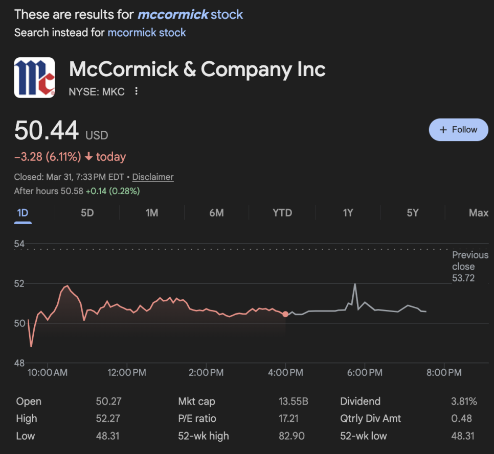 그런데 시장 반응이 아주 차가웠습니다. 맥코믹은 6.1% 빠졌고, 유니레버도 5% 넘게 하락했습니다.