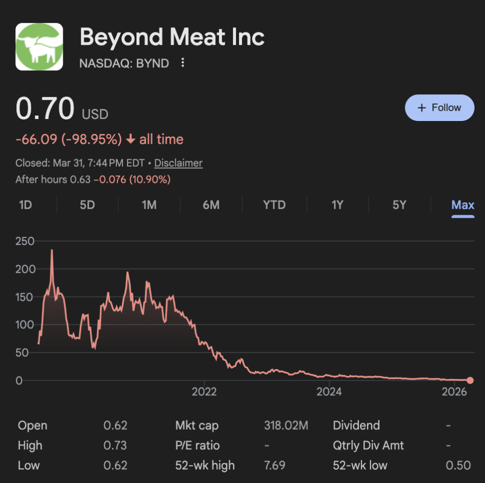 마지막으로 비욘드미트. 주가가 13% 하락했습니다. 매출이 6,160만 달러로 컨센서스 6,300만 달러에 못 미쳤고, 매출총이익이 전년 대비 86% 가까이 폭락했습니다. 86%입니다. 대체육 카테고리 자체에 대한 소비자 수요가 식어버렸고, 이 회사가 그걸 어떻게 반전시킬 수 있을지 지금으로선 뚜렷한 답이 보이지 않는 상황입니다.