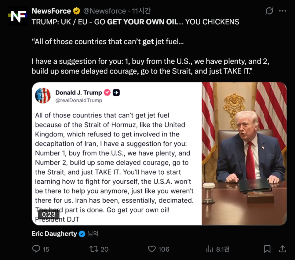 트럼프 대통령도 Truth Social에 "동맹국들이 직접 해협을 관리해라, 니네 기름은 니네가 챙겨라"는 식의 메시지를 올렸는데, 시장은 이걸 미국이 이 분쟁에서 피로감을 느끼고 있다는 신호로 읽었습니다. 그리고 장 마감 후 트럼프가 직접 "딜이 없어도 빠져나올 수 있다, 2~3주 안에 나오길 바란다"고 말하면서 그 해석이 맞았다는 게 확인됐죠.