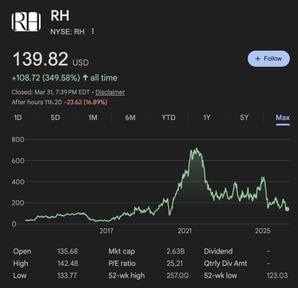 RH 같은 고가 인테리어 브랜드에 가장 치명적인 게 두 가지입니다. 고금리와 주택 거래 침체입니다. 사람들이 집을 사고팔 때 가구를 바꾸거든요. 집이 안 팔리고, 대출 이자가 비싸면, 소비자들은 50만 원짜리 쿠션이나 200만 원짜리 소파를 선뜻 지르지 않습니다. 그게 지금 RH가 처한 상황입니다.