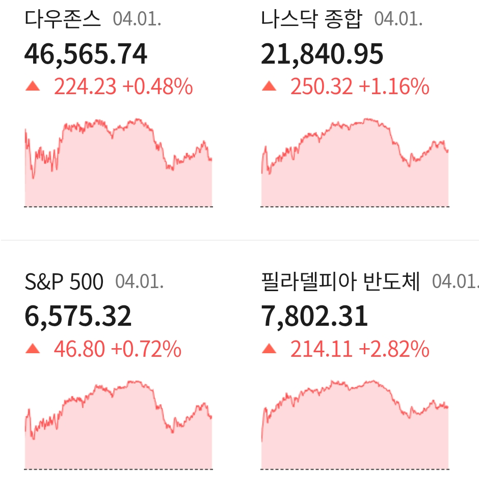 다우지수는 전일 대비 +0.48% 오른 46,565.74에 거래를 마쳤으며, 대형주 중심의 S&P500 지수는 전장 대비 +0.72% 상승한 6,575.32에 장을 마감하였습니다. 기술주 중심의 나스닥 지수는 전 거래일 대비 +1.16% 오른 21,840.95에 거래를 마치며 장을 마감하였습니다.