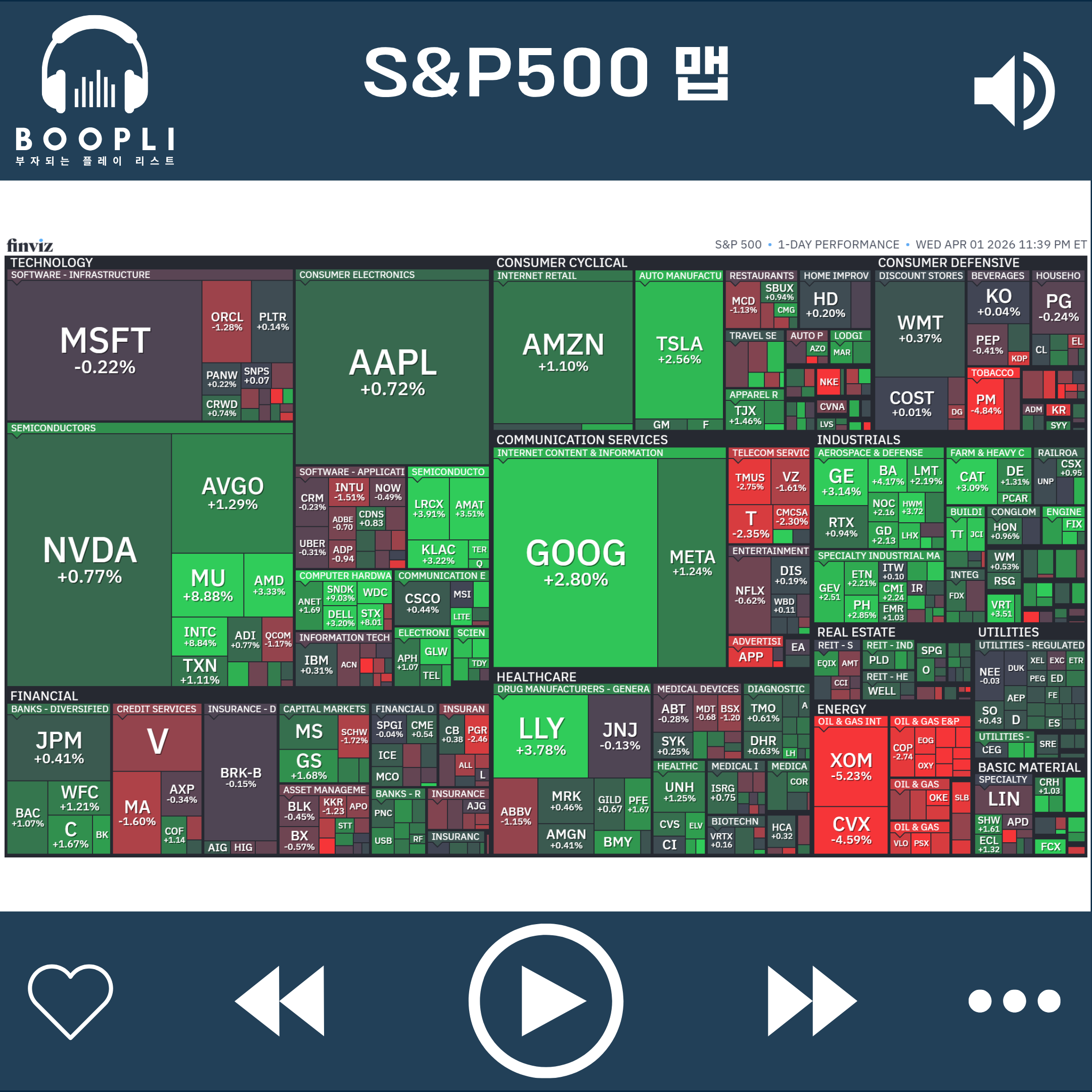 종목별로는 인텔이 자금난으로 매각했던 아일랜드 반도체 제조공장을 재매입한다는 소식이 구조조정 성공의 신호탄으로 해석되며 급등했고, 마이크론은 구글 터보퀀트발 메모리 수요 둔화 우려가 과장되었다는 분석과 레이 달리오의 매집 소식이 맞물리며 반도체 업종 강세를 주도