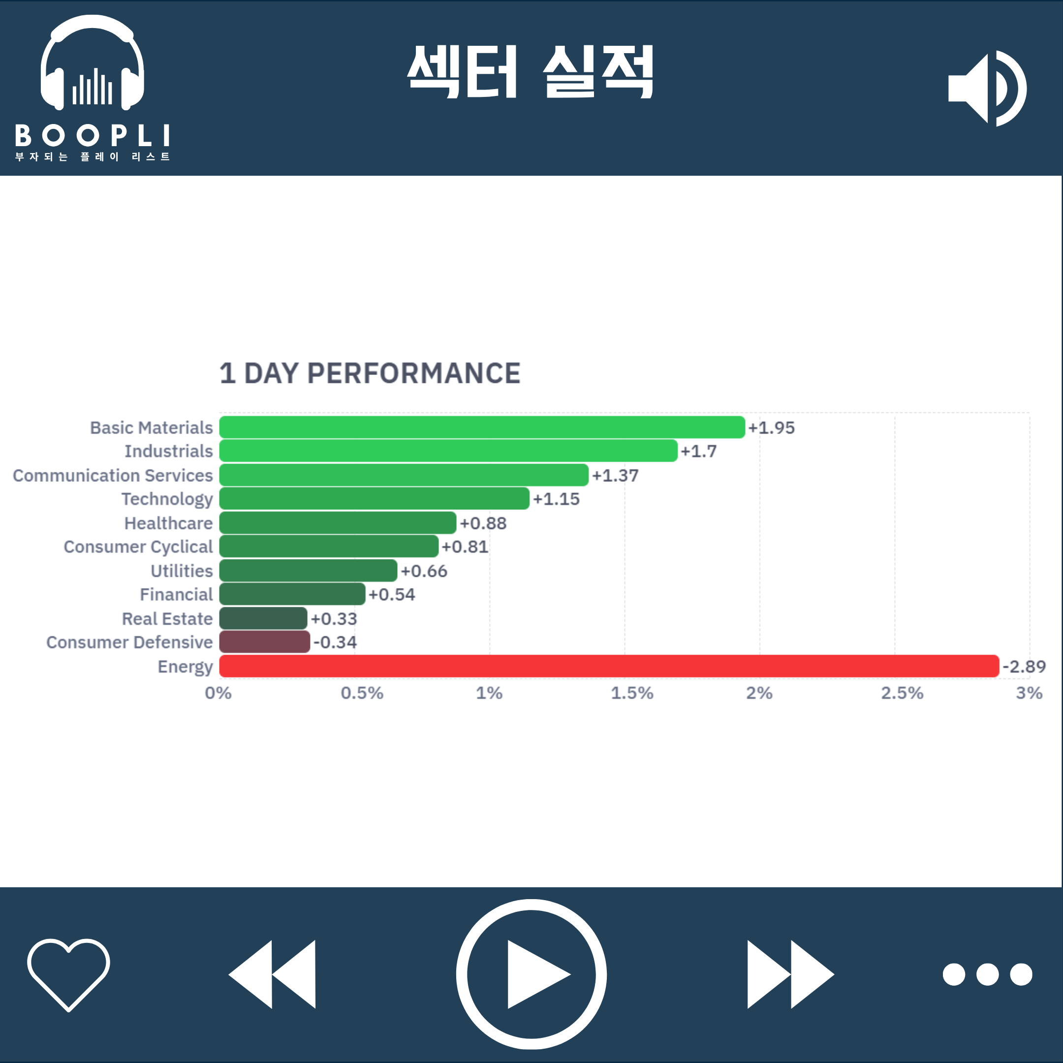 원자재 섹터가 상승을 주도했고, 이어서 산업재, 커뮤니케이션 서비스, 기술, 헬스케어, 소비 훈환재, 유틸리티, 금융 순으로 강세