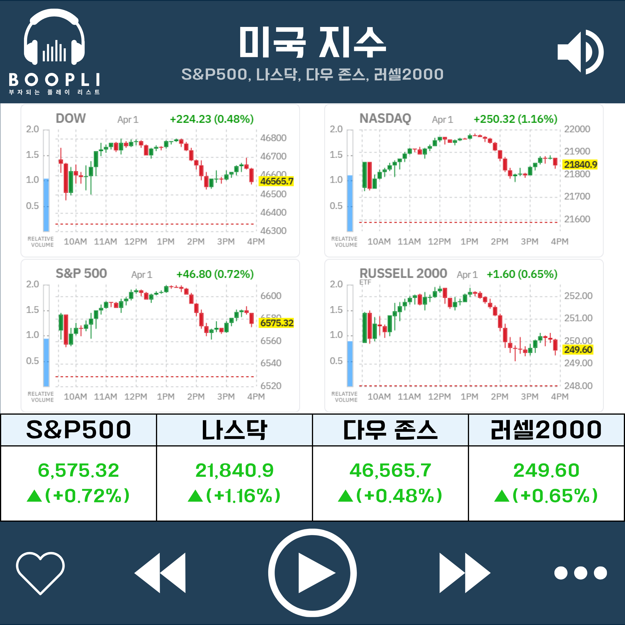 전일 미국 증시는 미-이란 간 엇갈린 발언에도 불구하고 종전 기대감이 지속되며 다우(+0.48%)는 강보합, S&P500(+0.72%), 나스닥(+1.16%), 러셀2000(+0.65%)은 상승하며 강세 마감