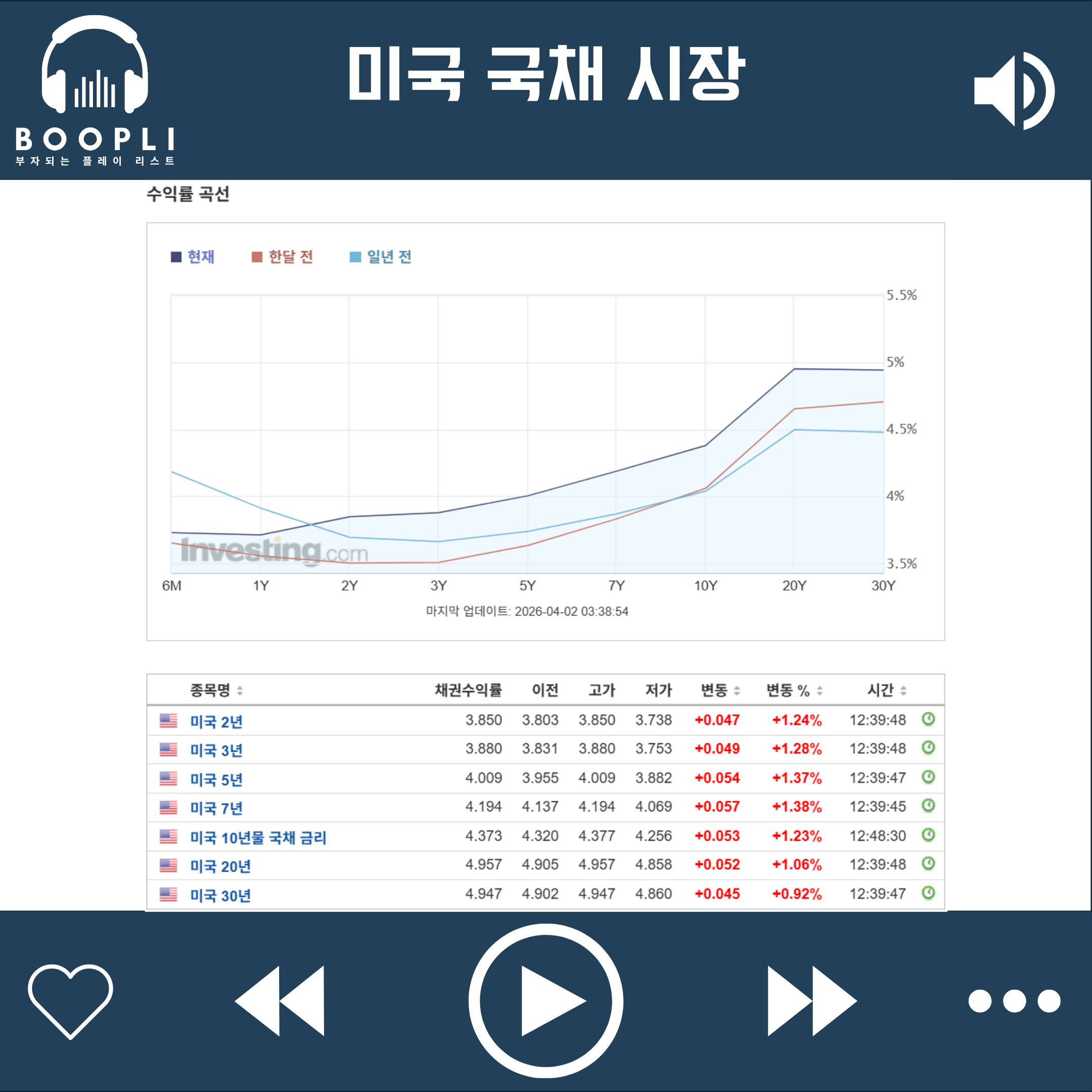 미국 국채는 미국과 이란 간 종전 협상 기대감 속에 국제 유가가 하락했으나, 민간고용, 소매판매, 구매관리자지수(PMI) 지표가 강세를 보이면서 장단기 금리 모두 강보합 마감