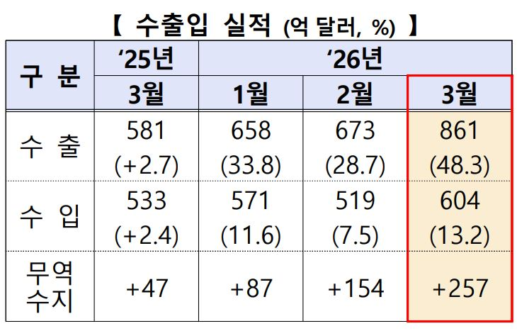 ‘26.3월 수출은 전년 동월 대비 48.3% 증가한 861.3억 달러, 수입은13.2% 증가한 604.0억 달러, 무역수지는 257.4억 달러 흑자를 기록했다.