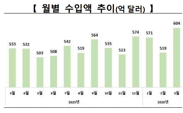 3월 수입은 13.2% 증가한 604.0억 달러로, 에너지 수입(93.7억 달러, △7.0%)은 감소했으나, 에너지 외 수입(510.2억 달러)은 17.9% 증가했다. 원유 수입은 중동 전쟁으로 유가가 급증하며 수입단가는 상승세를 보였으나, 호르무즈 해협 봉쇄에 따른 수입 차질로 수입물량이 감소하면서 5% 감소한 60억 달러를 기록했다. 비에너지는 반도체(86.1억 달러, +34.8%), 반도체장비(28.8억 달러, +4.4%) 등 품목의 수입이 증가했다.