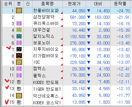 매도 : 기아 삼일제약 SOL전고체배터리 SK하이닉스 한화 DB하이텍 삼화콘덴서 코스모신소재 POSCO홀딩스 삼성전자 삼성SDI 이수페타시스 대한광통신(+31.35%) 한화에어로스페이스 삼성E&A 한미반도체 우리로(+215.70%) LG화학 한전기술 현대로템 LG씨엔애스 LG전자 전진건설로봇 한화엔지 유진테크 후성 CJ제일제당 KODEX레버리지 서진시스템 에코프로비엠 실리콘투 Tiger2차전지테마 LG에너지솔루션 Tiger2차전지TOP10레버리지 PLusK방산 나우로보틱스