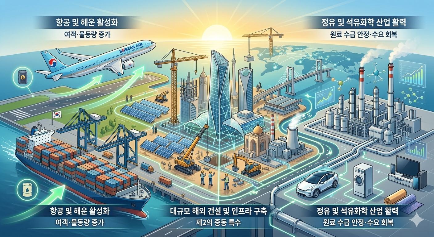 과거부터 중동 지역은 국내 건설 및 엔지니어링 기업들의 훌륭한 진출 무대이자 성장의 발판이었습니다. 지정학적 불안감이 완전히 해소된다면, 해당 지역 국가들은 그동안 미루어두었던 대규모 국가 재건 프로젝트와 도시 인프라 확충 사업을 본격적으로 재개할 가능성이 농후합니다. 특히 석유 의존도를 낮추고 미래 산업을 육성하려는 중동 주요국들의 탈석유화 기조와 맞물려, 스마트 시티 조성, 대규모 플랜트, 도로, 항만, 그리고 태양광과 같은 친환경 에너지 시설 등 다양한 분야에서 세계적인 기술력과 시공 능력을 인정받은 국내 기업들에게 엄청난 규모의 수주 기회가 열리게 됩니다. 과거의 영광을 재현할 수 있는 제2의 중동 특수가 다시 한번 펼쳐질 수 있는 탄탄한 토대가 마련되는 셈입니다.