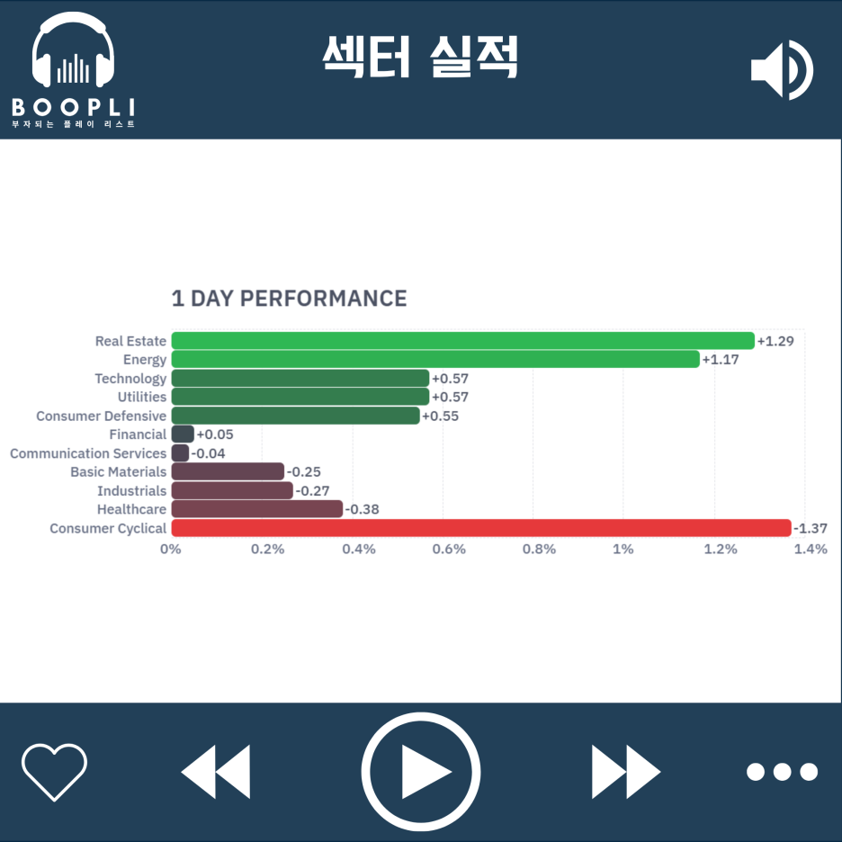 부동산 섹터가 상승을 주도했고, 이어서 에너지, 기술, 유틸리티, 경기 방어주 순으로 강세