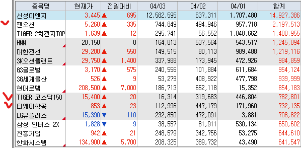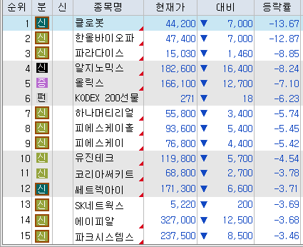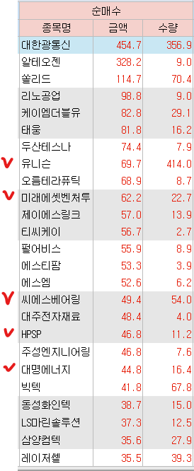 매도 : SK하이닉스 한화 삼성전자 코리아써키트 한올바이오파마(+52.83%) 대한광통신(+62.50%) 이노와이어리스(+63.92%) 후성 SK이노베이션 CJ제일제당 KODEX레버리지 알테오젠 삼성바이오로직스 실리콘투 LG에너지솔루션 PLUSK방산 나우로보틱스 티엑스알로보틱스