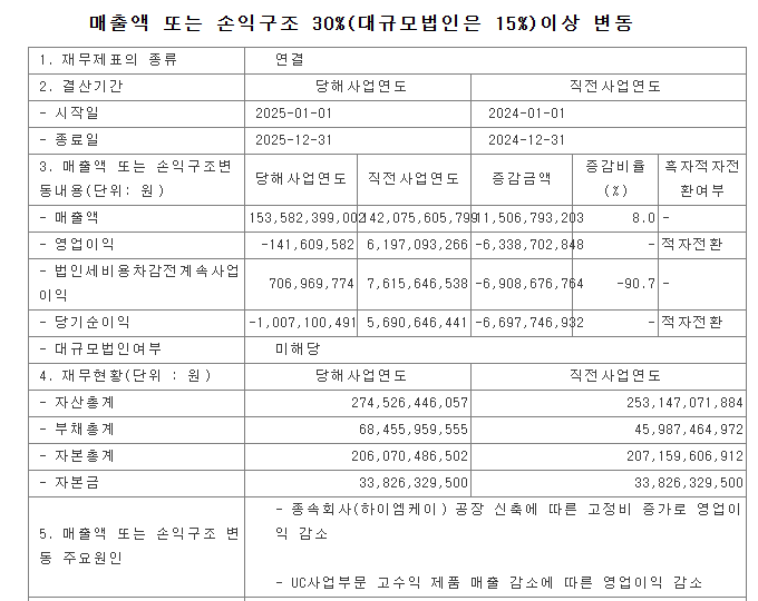 자회사 하이엠케이의 구미 공장 신축 등 대규모 시설 투자가 진행되면서 감가상각비 등 고정비가 급증했습니다. 또한, 주력 사업인 울트라커패시터 부문에서 고마진 제품의 매출 비중이 일시적으로 하락하며 수익성이 악화되었습니다.