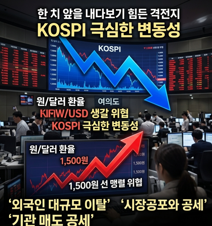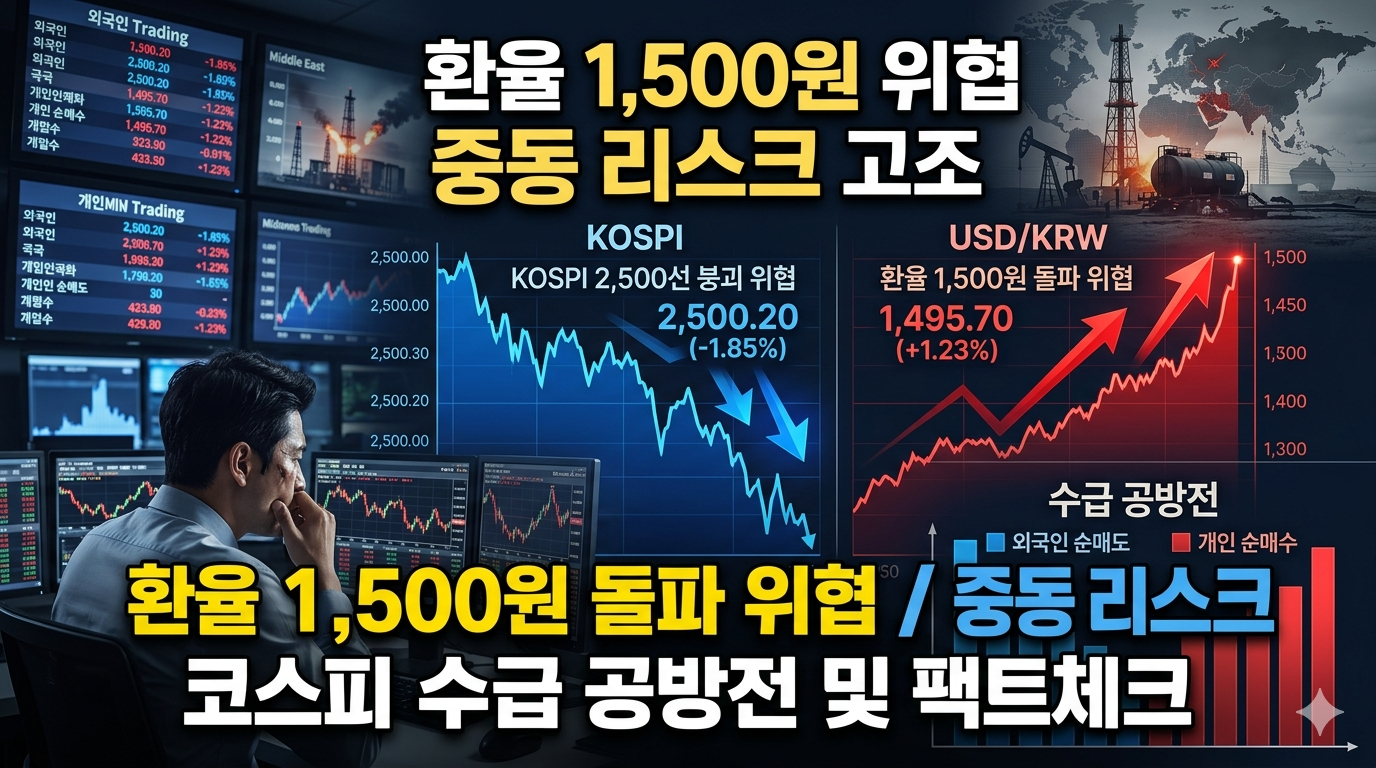 지난주 우리 주식시장은 그야말로 한 치 앞을 내다보기 힘든 거대한 격전지와 같았습니다. 모니터 창을 켜두고 지켜보는 내내 푸른빛이 쏟아지며 지수 전체가 극심한 변동성을 보였죠. 중동발 지정학적 위기가 고조되면서 거시경제 지표들이 일제히 출렁였고, 그 중심에는 1,500원 선을 맹렬하게 위협하던 원달러 환율이 있었습니다. 달러 강세 기조가 뚜렷해짐에 따라 외국인 자본의 대규모 이탈 현상이 발생하며 코스피 지수를 강하게 억눌렀습니다.