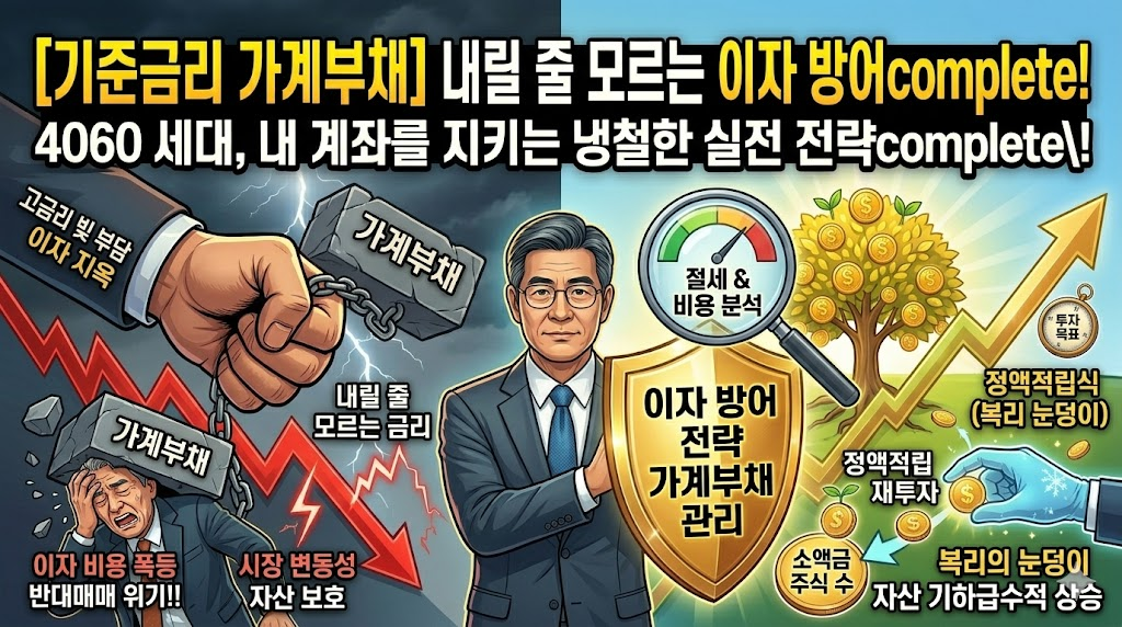 이러한 엄중한 흐름 속에서 은퇴를 앞두거나 이미 노후 자산을 운용하고 있는 4060 투자자분들은, 언젠가는 금리가 내릴 것이라는 막연한 기대감에 의존하여 무리한 투자를 지속해서는 안 됩니다. 지금은 단기적인 수익률을 좇기보다 철저한 가계부채 리스크 관리와 견고한 자산 방어벽 구축에 총력을 기울여야 할 때입니다. 보유 중인 대출의 금리 구조를 면밀히 점검하고, 이자 부담의 변동성이 큰 대출은 상대적으로 안정적인 고정금리로 전환하여 지출의 불확실성을 통제하는 전략이 선행되어야 합니다. 과도한 타인 자본을 활용한 신규 자산 취득은 엄격하게 지양하고, 꾸준한 현금 흐름을 창출해 내는 배당주나 이자 수익을 확정 지을 수 있는 안정적인 우량 채권형 자산으로 포트폴리오의 무게 중심을 과감하게 이동시키는 지혜가 필요합니다. 가계부채 연착륙과 진정한 기준금리 인하 사이클이 도래할 때까지, 투자 체력을 비축하는 소중한 시기로 활용하시길 권해드립니다.