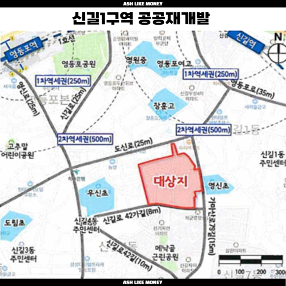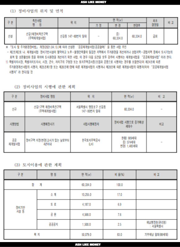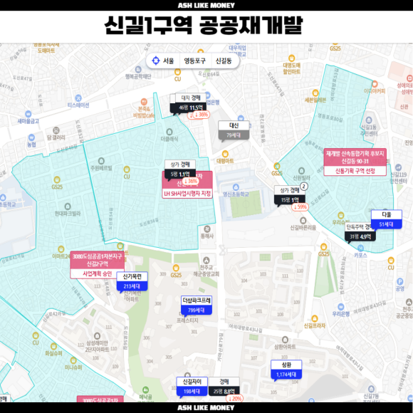 신길1구역은 영등포구 신길동 147-80번지 일대 60,334제곱미터(18,283평) 부지에 지하 4층~지상 45층 규모의 아파트 11개동의 1,483세대 아파트를 짓는다. 과거 05년도 신길뉴타운으로 지정되었으나 17년도 재정비촉진계획 해제로 사업이 중단되었다. 05년도에는 한창 부동산 호황기였기에 뉴타운 사업이 유행하였으나 글로벌 금융위기가 발생하고 초기 재개발 구역 및 사업이 지지부진한 곳은 해제되었다. 신길1구역도 사업이 중단되었다가 21년 공공재개발 1차 후보지로 선정되며 사업이 재개되었고 작년 LH와 사업시행약정을 체결하면서 사업이 본격화되기 시작했다.