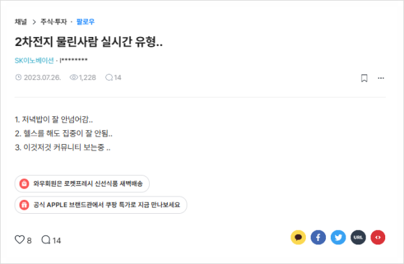 에코프로비엠은 최근 주가가 반등 흐름을 보이고 있다. 그러나 워낙 변동이 많아 오히려 개인 투자자들은 경계심을 보인다. 주가가 올라갈수록 전환사채 투자자들의 차익실현 매물이 더 많이 쏟아질 수 있기 때문이다. 사모펀드는 4,400억 규모의 에코프로비엠 전환사채를 보유하고 있다. 또한, 단기 실적 변동성을 피하기는 어려워보인다. 증권사에선 에코프로비엠이 올해 1분기 매출 5,840억원, 영업손실 39억으로 5개 분기 만에 다시 적자를 전환할 지도 모른다는 전망을 밝혔다.