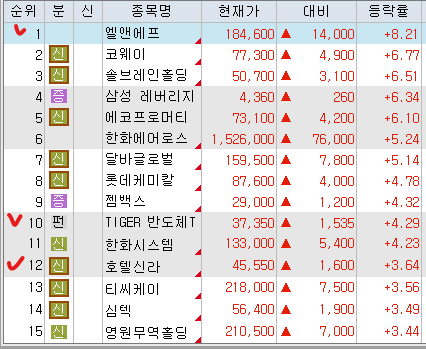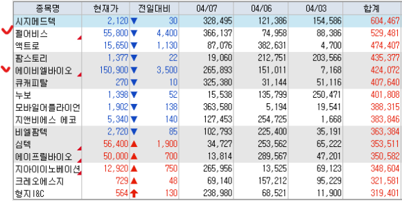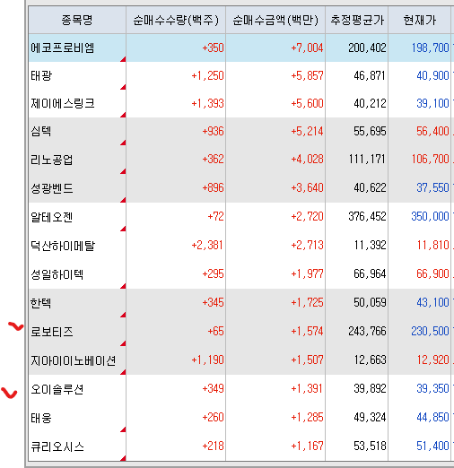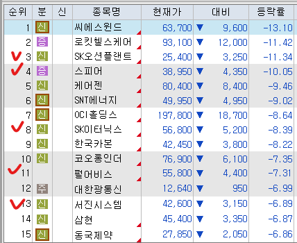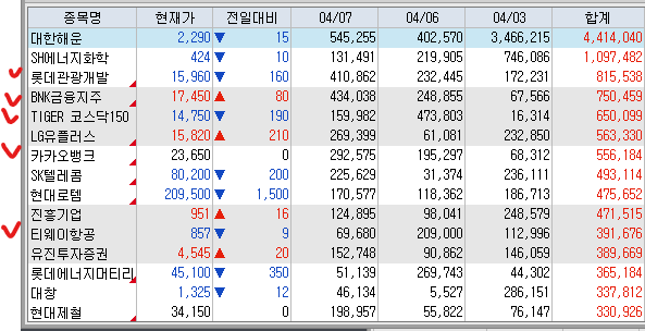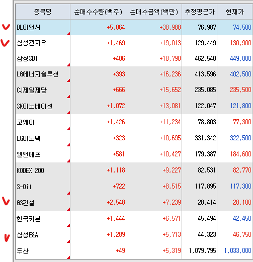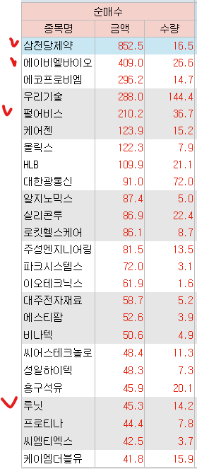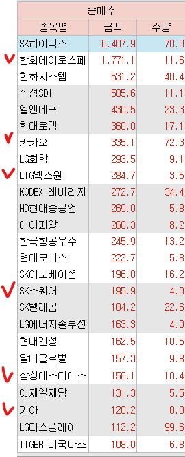 매도 : SK하이닉스 효성 삼성전자 삼성전자우 대한광통신(+66.20%) LG화학 리노공업 SK이노베이션 KB금융 씨에스윈드 한국콜마 심텍 실리콘투 솔루스첨단소재 성일하이텍 LG에너지솔루션 에이프릴바이오 달바글로벌 루닛신주인수권