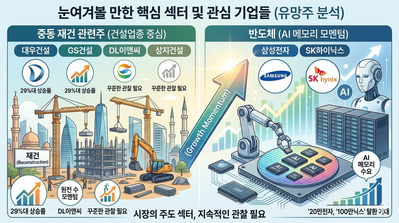 삼성전자 & SK하이닉스:이른바 '20만전자', '100만닉스' 탈환에 대한 기대감이 다시 피어오르고 있습니다. 글로벌 AI 메모리 수요가 지정학적 리스크를 압도할 만큼 탄탄하다는 점이 증명되고 있으므로, 핵심 포트로 계속해서 주목해야 할 우량주들입니다.