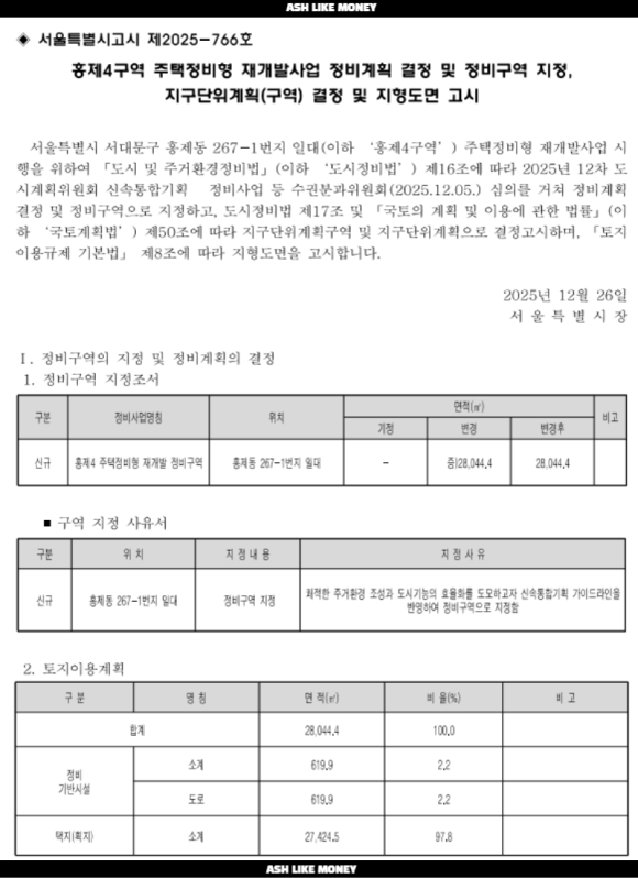 홍제4구역은 재개발 신통기획사업을 통해 도정법으로 개발하기 위한 정비구역으로 지정되었다. 정비구역 지정은 25년 12월에 공고고시된 따끈따끈한 사업이다. 홍제4구역의 위치는 홍제동 267-1번지 일대로 3호선 홍제역 도보권으로 종로, 을지로의 CBD의 주거배후지로 해당 업무지구에 일자리가 있다면 충분히 살 만한 곳이다. 게다가 3호선은 2호선, 9호선과 함께 강남을 환승없이 갈 수 있는 최상위 노선이기에 비록 물리적으로 거리가 좀 멀더라도 3호선을 이용할 수 있다. 교육환경으로 인근 인왕초, 홍제초, 인왕중, 상명대, 명지대 등 대학가도 인접하다.
