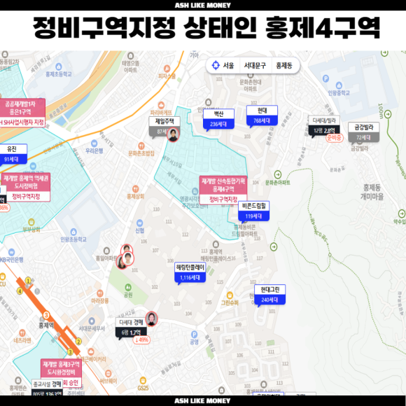 서울 서대문구 홍제4구역은 3호선이라는 서울 최상위 노선이 지난다. 홍제동이 은평구와 헷갈릴 수 있지만 서대문구 소속이며 은평구와 접해있다. 홍제동은 직선거리로 광화문과 약 3km, 서울시청과 3.5km, 서울역까지 4km로 도심권에 직장이 있는 사람들에게 훌륭한 주거지가 될 수 있다. 북한산의 정기를 받을 수 있는 녹지환경과 더불어 조용한 분위기지만 서울 핵심지와는 거리가 있고 경사가 좀 있는 곳이다. 오늘은 서대문구 홍제4구역 재개발 정비구역지정 사업성 분담금 분석입니다.