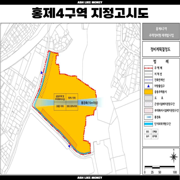 홍제4구역의 사업면적은 8,498평이고 3종일반주거지역 면적이 8,367평이고 나머지는 2종일반주거지역 면적이다. 정비기반시설 중 도로면적은 187평이므로 아파트 사업면적은 8,310평이 된다. 최고 높이 137미터, 최고 28층 이하로 계획된다. 최대 허용용적률은 300%, 상한 용적률 280%이며, 재개발 구역이기에 용적률을 알 수 없어 기존 용적률은 160~200%로 가정하여 180%로 계산했다. 기존 연면적은 14,958평, 상한 용적률 280%를 적용하면 연면적은 23,268평, 주민공동시설 1,179평, 근린생활시설 272평, 이 중 임대주택 면적은 10% 2,326평을 적용하면 일반분양 면적은 4,533평이다.
