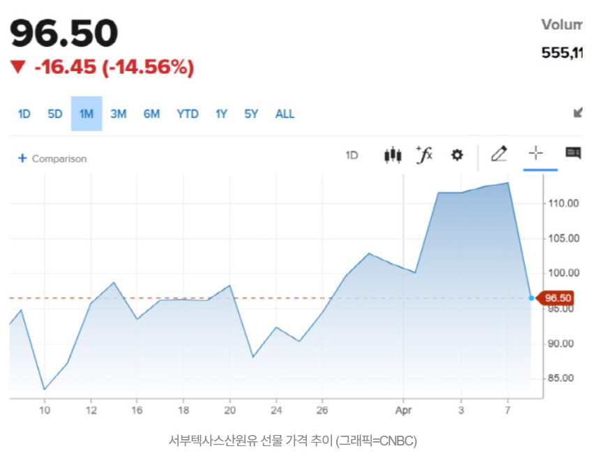 ● 국제유가는 전쟁 리스크 완화 기대에 급락했다. 뉴욕상업거래소에서 5월 인도분 서부 텍사스산 원유(WTI)는 18.54달러(16.41%) 내린 94.41달러에 마감했다. 런던 ICE 선물거래소에서 6월 인도분 브렌트유는 전장보다 14.52달러(13.29%) 하락한 배럴당 94.75달러에 거래를 마쳤다.