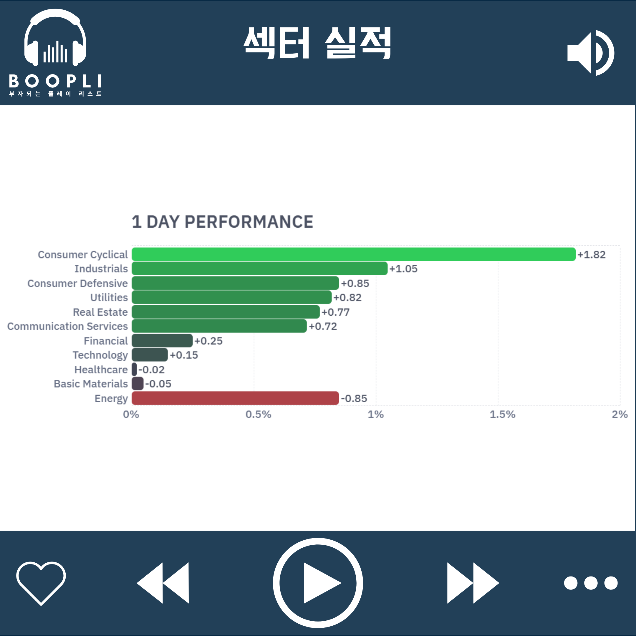 아마존의 강세로 소비 순환재가 상승을 주도했으며, 이어서 산업재, 경기 방어주, 유틸리티, 부동산, 커뮤니케이션 서비스 순으로 강세