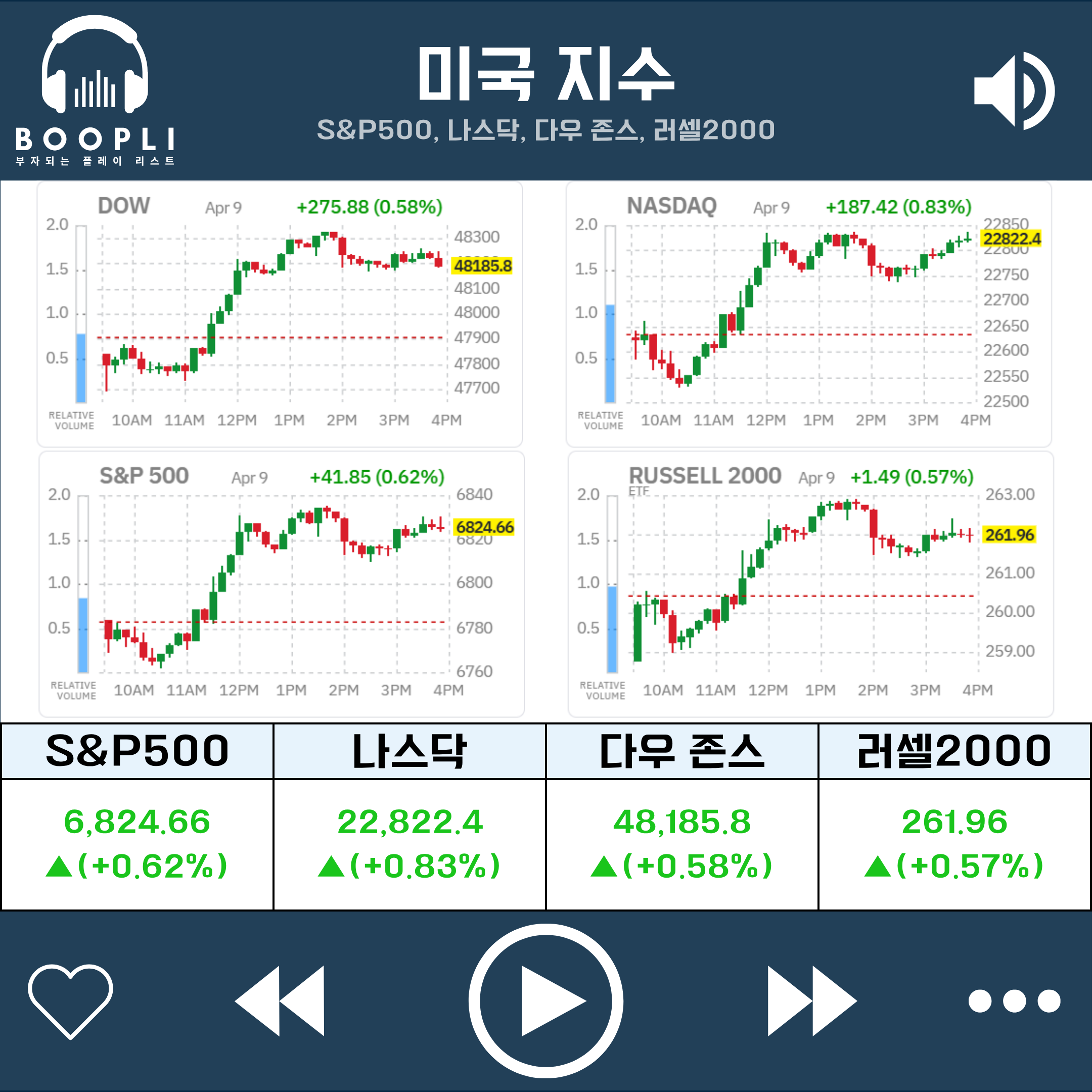 장 후반에는 네타냐후 총리가 "레바논에 휴전은 없다"고 발언하면서 일시적으로 매물이 출회되기도 했으나, 미 국무부가 이스라엘과 레바논이 다음 주 회담에 나선다고 공식 확인하자 투자 심리가 빠르게 회복되며 주요 지수 모두 상승세로 마감