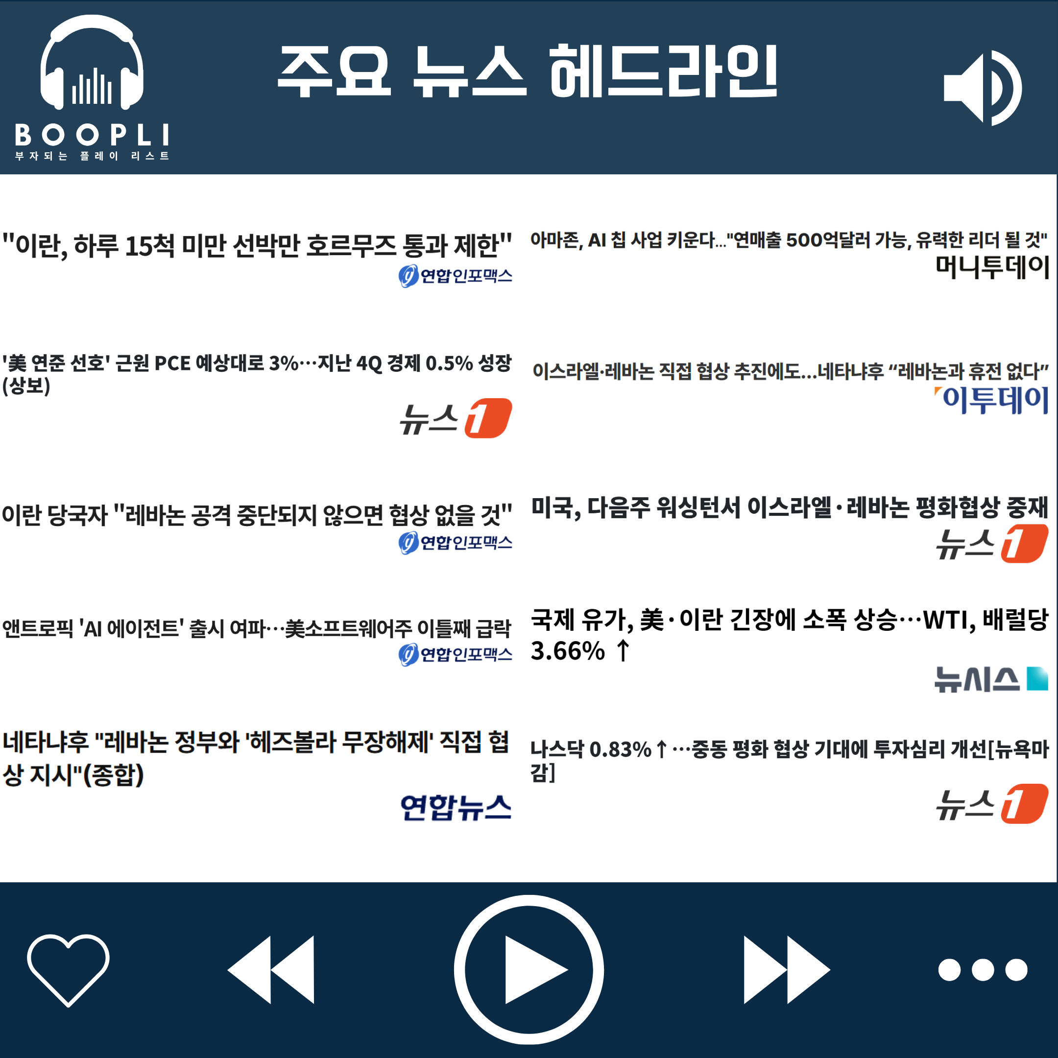 장 초반 증시는 이란의 호르무즈 해협 통제 강화와 경제 지표 부진이 맞물리며 주요 지수 모두 약보합으로 출발한 뒤, 이스라엘의 레바논 공격 지속에 따른 휴전 협상 차질 우려가 부각되며 낙폭을 확대