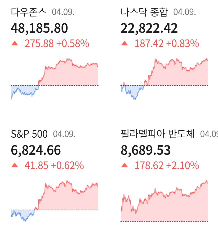 현지 시간 9일 미국 뉴욕 증시는 3대 지수 모두 상승 마감하였습니다. 이스라엘의 레바논 타격이 있었지만 직접 협상 가능성이 부각되면서 미국과 이란간의 2주 휴전 유지 기대가 확대되면서 투자 심리가 빠르게 개선 된 것으로 분석되고 있습니다.