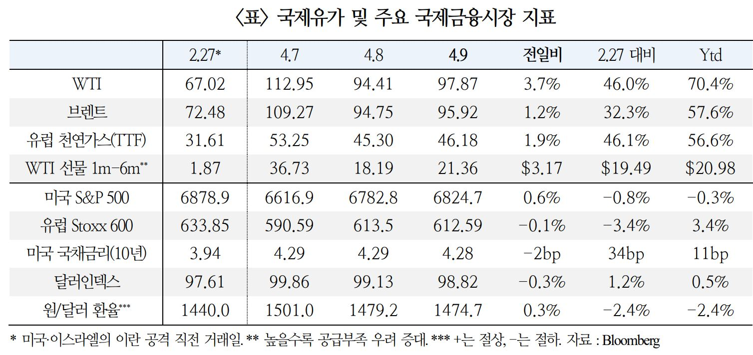 – 다만, 호르무즈 해협 재개방이 지연될 경우 Brent 유가는 2분기 $115 → 3분기 $105 → 4분기 $101로 예상되고, 생산 차질까지 더해질 경우 2분기 $135 → 3분기 $120 → 4분기 $115 흐름을 보일 것으로 전망