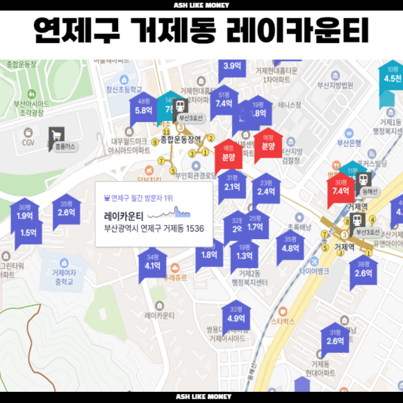 부산의 남구는 해수동 다음으로 떠오르는 구이다. 해운대는 대한민국 사람이라면 누구나 아는 바닷가로 중동과 우동이 오션뷰로 유명하여 비싼 가격을 유지하고 있다. 수영구 역시 광안리가 매우 유명하고 남천동의 삼익비치가 재건축되어 그랑자이로 탄생하면 향후 부자들의 세컨드하우스가 될 것이다. 남천동은 부산의 부촌이지만 현재 서울의 최고 부촌에 비하면 가격이 크게 차이가 난다. 내륙인 동래구는 과거에 비해 죽었고 그대신 광안리 근처의 남구가 살아나고 있다. 연제구는 내륙이지만, 진구와 동래구 사이의 요지에 위치하고 레이카운티는 연제구에 위치한다.
