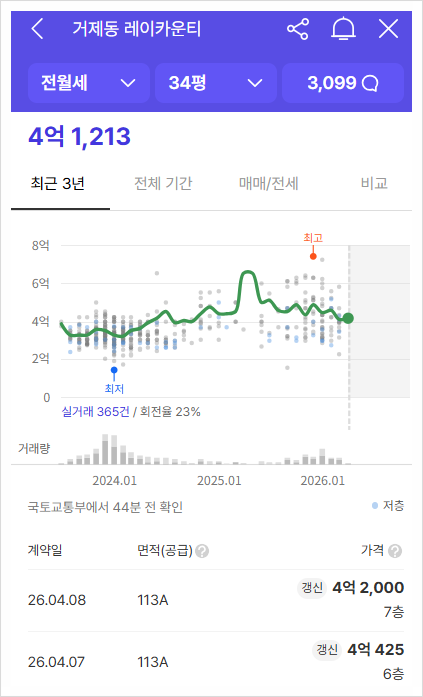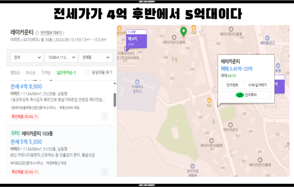 레이카운티는 비규제지역이기에 당첨된다면 전세를 줄 수 있다. 수도권이 아니기에 조건부 전세대출이 가능하며 LTV는 70%이다. 토지허가거래구역도 아니라 거주의무도 없고 분양가상한제도 아니다. 전매제한도 6개월이라 21년에 전매제한도 풀렸다. 현재 84타입의 전세가가 4억 2천만원인데, 이는 현재 갱신권을 쓴 상태라 가격이 더 상승한 지금에 있어서는 전세가가 더 올라갈 수 있다. 매물들을 보면 전세가가 5억 정도이기에 분양가가 6억에서 7억인 것을 감안하면 내 돈은 1억~2억만 있으면 된다.