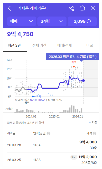 분양가는 34평이 5억 100만원~7억 1,000만이었다. 최근 34평의 시세가 9.4억에 실거래되었다. 25평은 6억 5,800만원 수준이다. 전세가는 34평이 4억 2천, 25평도 4억원 수준이라 전세가 차이는 그리 크지않다. 부산은 비규제지역이기에 청약에 당첨되고 전세로 잔금을 치를 수 있다. 재분양된 세대는 84타입의 3단지로 각각 1단지 1세대, 3단지 2세대이다. 분양가가 5억~7억임을 가정하면 10억 이상의 매물까지 넘어가면 시세차익은 최대 5억도 가능하다.