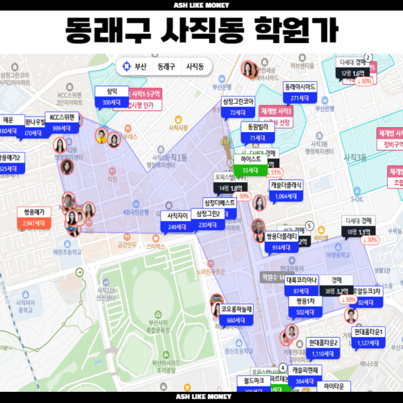 입지도 부산광역시청, 연제구청 등의 행정기관과 더불어 부산고등법원, 부산지방검찰청, 법무법인 등이 모여있는 법조단지가 근처에 위치한다. 학교들과 사직역부터 종합운동장역까지 이어지는 부산 최대의 학원가인 사직학원가 역시 근접하다. 부산아시아드주경기장, 사직실내체육관, 사직야구장 등 문화시설도 풍부하다. 다만, 부산 사직동 일부는 경사가 심하고 레이카운티 자체자 세대수는 크지만 초품아는 아니다.