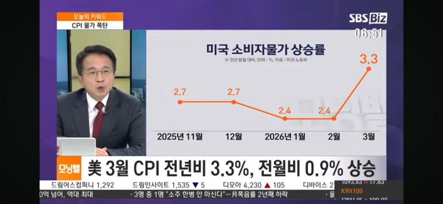 - 美 3월 CPI 전년비 3.3%, 전월비 0.9% 상승