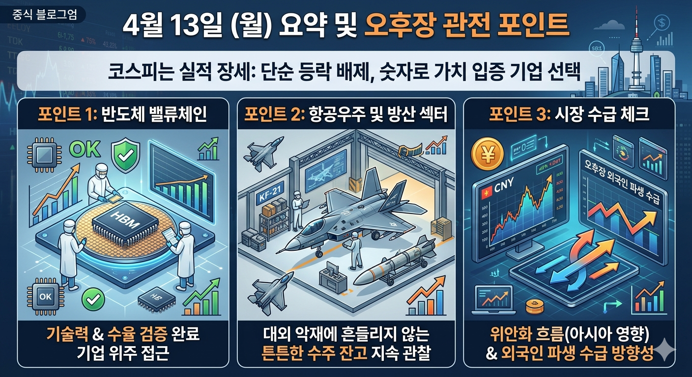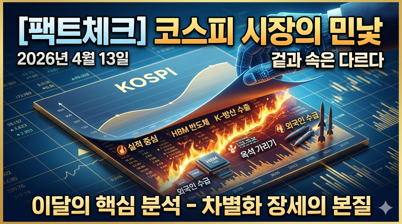 오늘 4월 13일 코스피는 지수의 단순 등락에 일희일비할 장세가 아닙니다. 실체가 없는 막연한 기대감은 철저히 배제되고, 숫자로 자신의 가치를 입증해 내는 기업만이 선택받는 철저한 실적 장세입니다.
