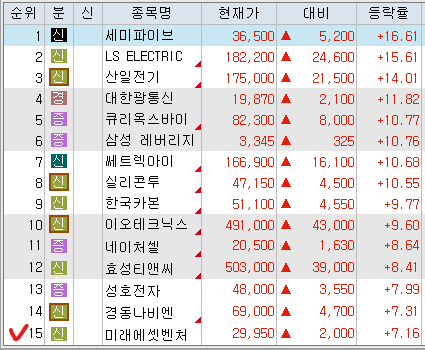 AI 인프라 핵심 기술로 주목받고 있는 광통신/5G 관련주가 강세(우리로, 광전자, 기산텔레콤 우리넷 네이블 웨이브일렉트로 빛샘전자 알에프텍 주성코퍼레이션 알앤투테크놀로지 티엠씨 에프알텍 라이콤상한가, 코위버 +21.01%, 쏘닉스 +15.24%, 이오인스트루 +14.19%, 대한광통신 +11.82%, 이노와이어리스 +10.76%)
