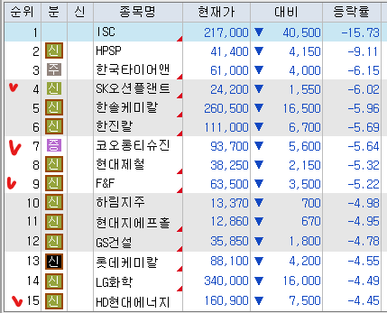 반면 최근 오름세를 보였던 2차전지 업종이 하락. 조선, 자동차 업종도 하락