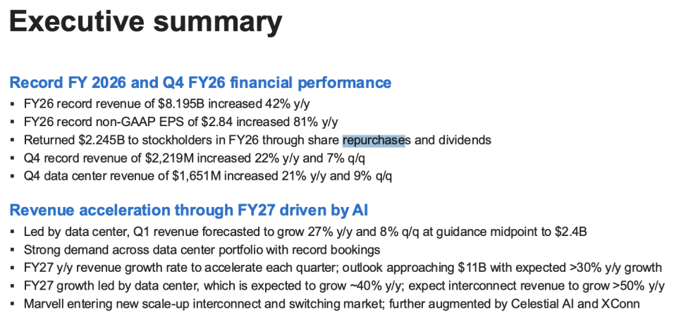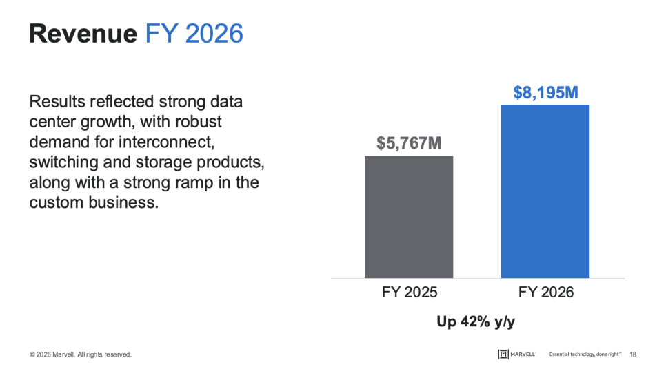 마벨은 지난 분기에 약 22억 2천만 달러의 매출을 기록하며 시장의 기대를 훌쩍 뛰어넘는 성적을 거뒀습니다. 특히 2027 회계연도 매출 목표를 당초 예상보다 10억 달러 더 높은 110억 달러로 상향 조정하며 엄청난 자신감을 내비쳤습니다.
