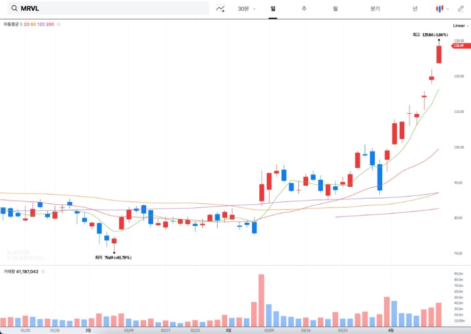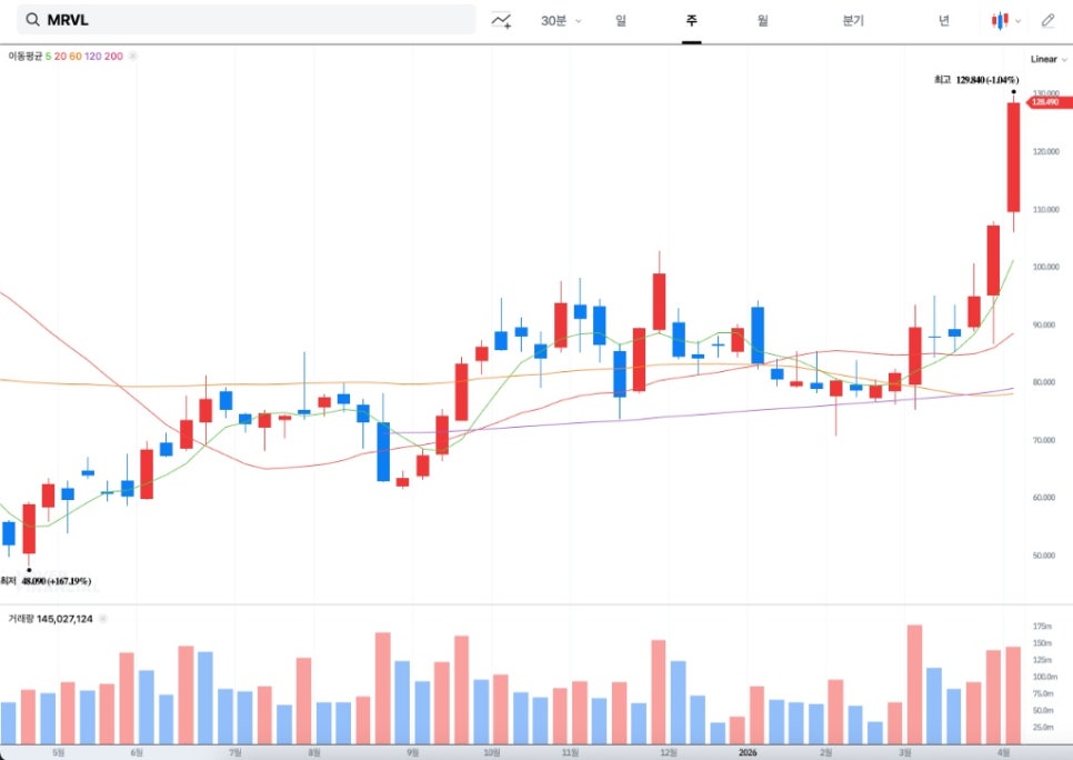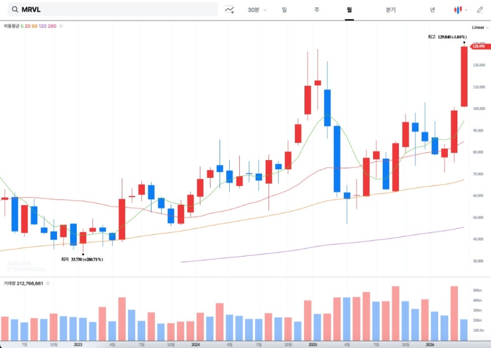 마지막으로 월봉 차트를 보면 마벨의 '역사'가 보입니다. 2023년 초 33.75달러였던 저점 대비 무려 280% 넘게 수직 상승하며 거대한 'U자형' 반등을 완성했습니다. 2024년 말에 잠시 숨을 고르는 듯하더니, 2026년 들어서는 이전의 고점들을 모두 발아래에 두는 신고가 랠리를 펼치고 있죠. 모든 이동평균선이 정배열로 늘어서서 위를 향하고 있는 만큼, 전반적인 추세는 여전히 매우 견고하다고 볼 수 있습니다.