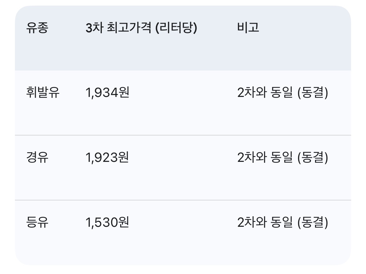 정부가 오늘(10일) 0시부터 앞으로 2주간 적용될 3차 석유 최고가격을 발표했습니다. 국제 석유제품 가격 상승에도 불구하고, 민생 안정을 위해 지난 2차와 동일한 수준으로 결정되었습니다.