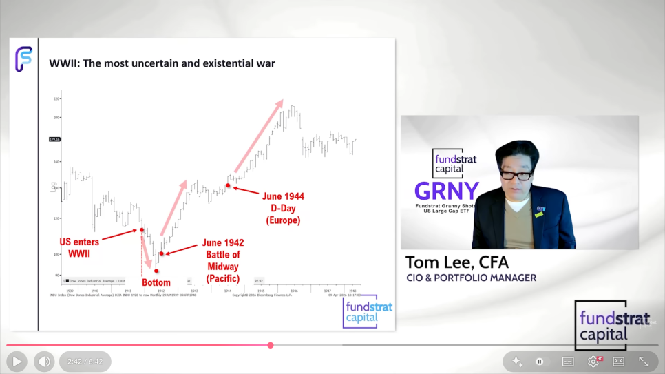 톰 리가 이렇게 자신 있게 '바닥'을 논하는 데는 역사적인 근거가 있다고 합니다. 지난 125년 동안 발생한 8차례의 주요 전쟁 사례를 보면, 증시는 늘 전쟁 기간의 초입인 10% 지점에서 바닥을 형성했기 때문입니다. 예를 들어 제2차 세계대전 당시 미국이 참전하고 나서 실제 전쟁은 45개월이나 지속됐지만, 증시는 참전 단 5개월 만에 바닥을 찍고 반등을 시작했죠. 노르망디 상륙작전 같은 결정적인 승전보가 들려오기 훨씬 전부터 시장은 이미 오르고 있었다는 점을 강조한 겁니다.