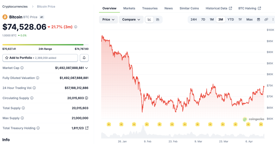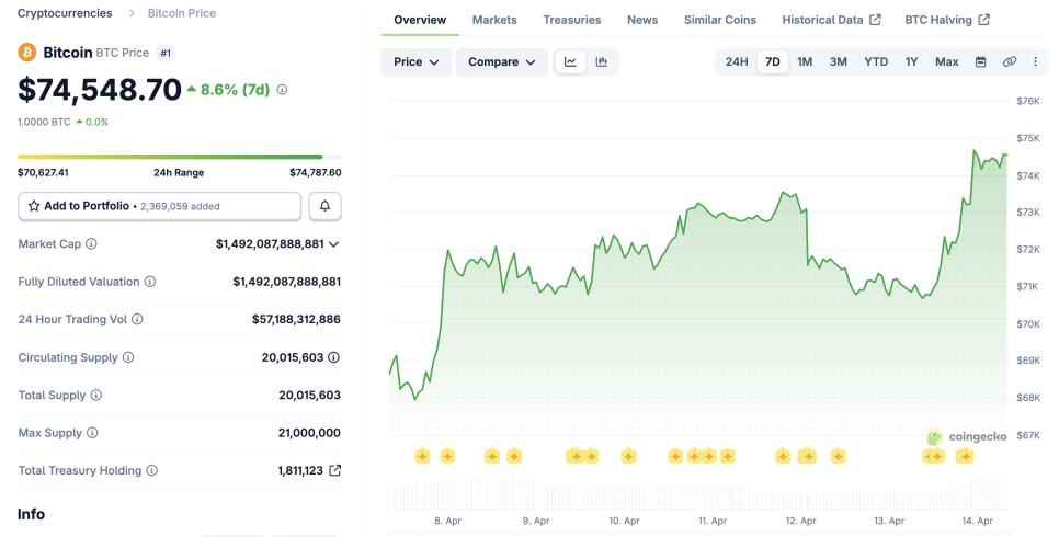 우선 비트코인(Bitcoin)이 4.9%나 튀어 오르며 74,400달러 선을 다시 밟았습니다. 주말 사이 70,600달러까지 밀리며 가슴 졸이게 하더니, 언제 그랬냐는 듯 반등에 성공한 건데요. 가상자산뿐만 아니라 미국 증시도 함께 웃었습니다.