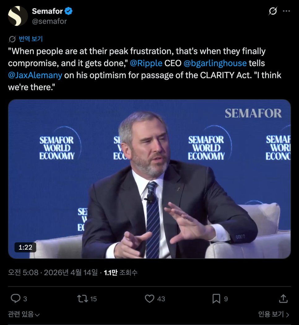 한편 코인 투자자들이 가장 기다리는 것 중 하나가 바로 '명확한 규제'인데요. 브래드 갈링하우스(Brad Garlinghouse) 리플(Ripple) CEO가 최근 아주 긍정적인 소식을 전했습니다. 그는 현재 미국 상원에서 논의 중인 '클래리티 법안(CLARITY Act, 스테이블코인 규제안)'이 이르면 5월 말 안에 통과될 것으로 내다봤습니다.