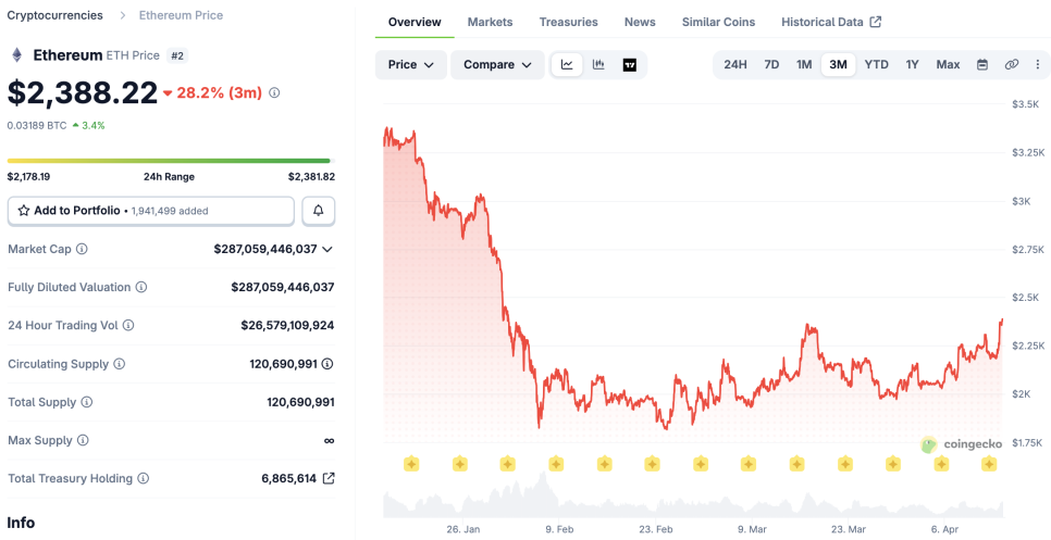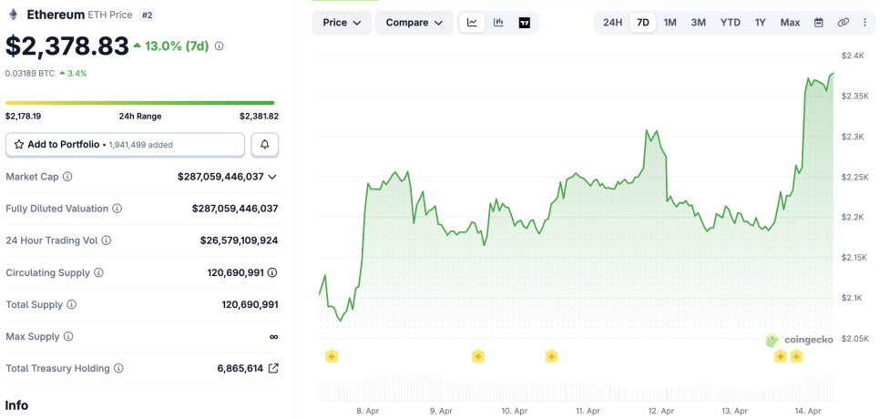한편 비트코인보다 강세를 보이고 있는 것은 바로 이더리움(Ethereum)입니다. 이더리움은 24시간 동안 7.9% 급등하며 2,365달러를 기록, 5% 정도 오른 비트코인을 압도했습니다.