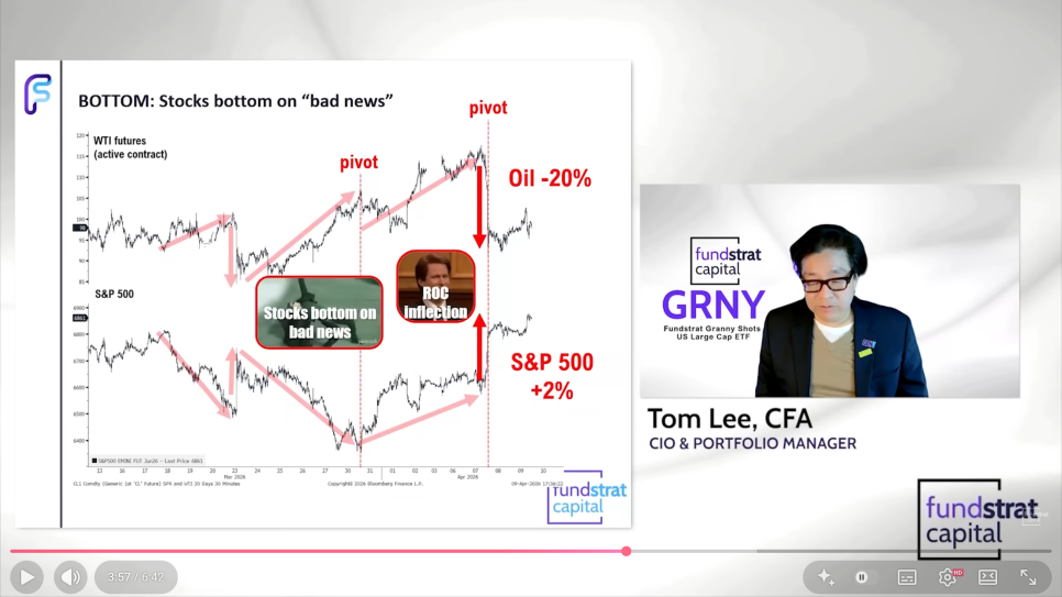 톰 리는 이번에도 바닥 신호로 세 가지 지표를 꼽았습니다. 첫째는 유가가 오르는데도 주가가 함께 상승하기 시작했다는 점입니다. 보통 유가와 주식은 반대로 움직이는데, 이 관계가 깨졌다는 건 시장의 체력이 그만큼 좋아졌다는 신호죠. 둘째는 '덜 나쁜 뉴스'의 등장입니다. 완전한 종전은 아니더라도 휴전 논의가 시작된 것 자체가 시장에는 이미 강력한 호재로 작용하고 있다는 분석입니다. 마지막으로 공포지수라 불리는 '빅스(VIX)'가 30 위에서 놀다가 최근 20 아래로 뚝 떨어졌다는 점을 들었습니다.