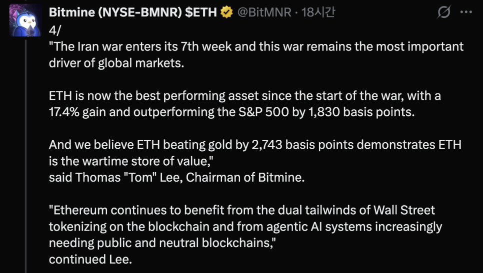 톰 리는 "이더리움이 전쟁 시작 이후 S&P 500보다 18% 이상 더 올랐다"며, 이제 금을 대신하는 '전쟁기 안전자산(Wartime store of value)'으로 자리 잡았다고 평가했습니다. 그러면서 그는 현재 시장을 짓누르는 '전쟁의 안개'가 서서히 걷히고 있으며, 사실상 시장의 바닥은 이미 지나갔을 가능성이 높다는 아주 흥미로운 분석을 내놓았습니다.