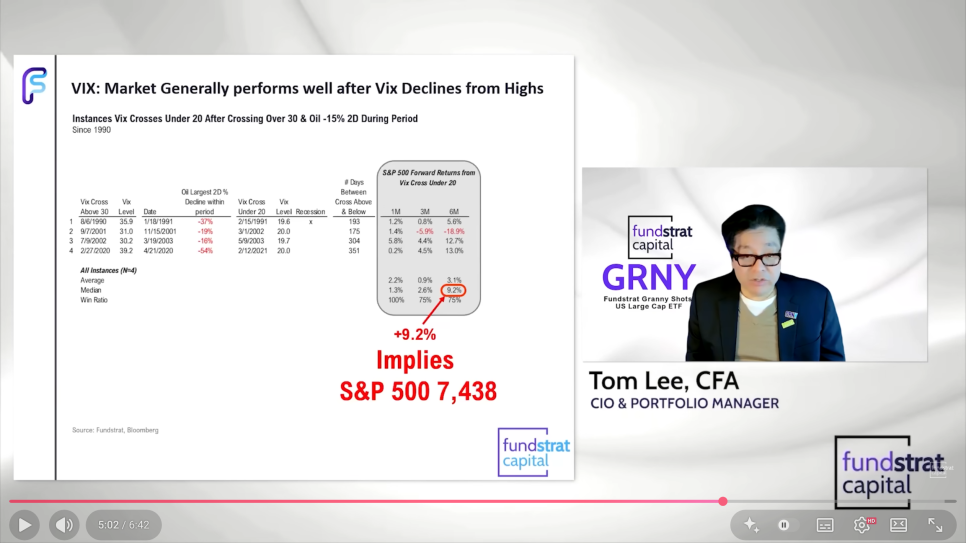 과거 데이터를 보면 빅스 지수가 이렇게 안정된 후 6개월 동안 증시가 평균 9% 정도 상승했다고 하는데요. 톰 리의 예측대로라면 S&P 500 지수가 사상 최고치를 경신하며 7,400선까지 갈 수도 있다는 계산이 나옵니다. 결국 전쟁이라는 거대한 불확실성 속에서도 자산 시장은 이미 다음 상승장을 준비하고 있다는 것이 그의 핵심 메시지입니다.