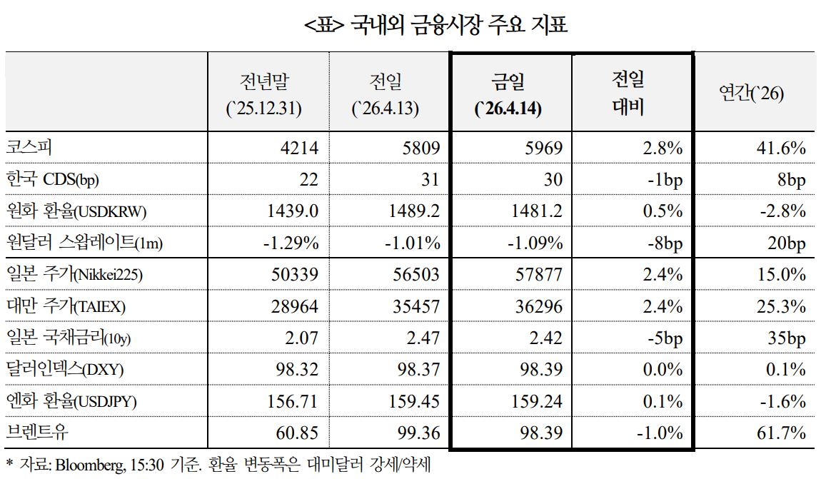 코스피는 미국·이란의 2차 협상 기대감으로 전쟁 이후 처음으로 장중 6000을 상회한 후, 상승폭을 축소하여 5,967.75로 마감(전일대비 +2.74%)